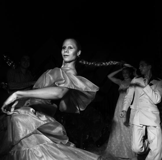 Non sono dichiarazioni sovrapposte alle immagini, le si vede se si guarda il modo con cui Fink scatta le fotografie. Quello che salta subito all’occhio è l’uso del flash che esaspera i contrasti di luce e oscurità. A volte – ce n’è un bellissimo esempio in mostra di due ragazze, una delle quali tiene per un braccio l’altra che pare in preda a un malore – isola le figure in uno sfondo che diventa completamente buio. Altre volte sembra che Fink non centri l’immagine e la luce del flash cade nel posto sbagliato, di lato, come se sparasse un po’ a caso nella mischia. L’effetto è curioso e particolare, meno compositivo e più vivo, di naturalezza e di fretta, prima che l’immagine sfugga. Così, in mostra, nel caso della donna obesa con abito a fiori, colpita in realtà al fiore al centro dell’esuberante seno, che sta tutta sulla destra e prende un’aria strana tra il mesto e non so che. Oppure la danzatrice dallo scatto repentino verso sinistra, che sembra come aver evitato il colpo – lo shoot, sparo e scatto –, che colpisce invece il giovane alle sue spalle (sparato, bruciato dalla luce).