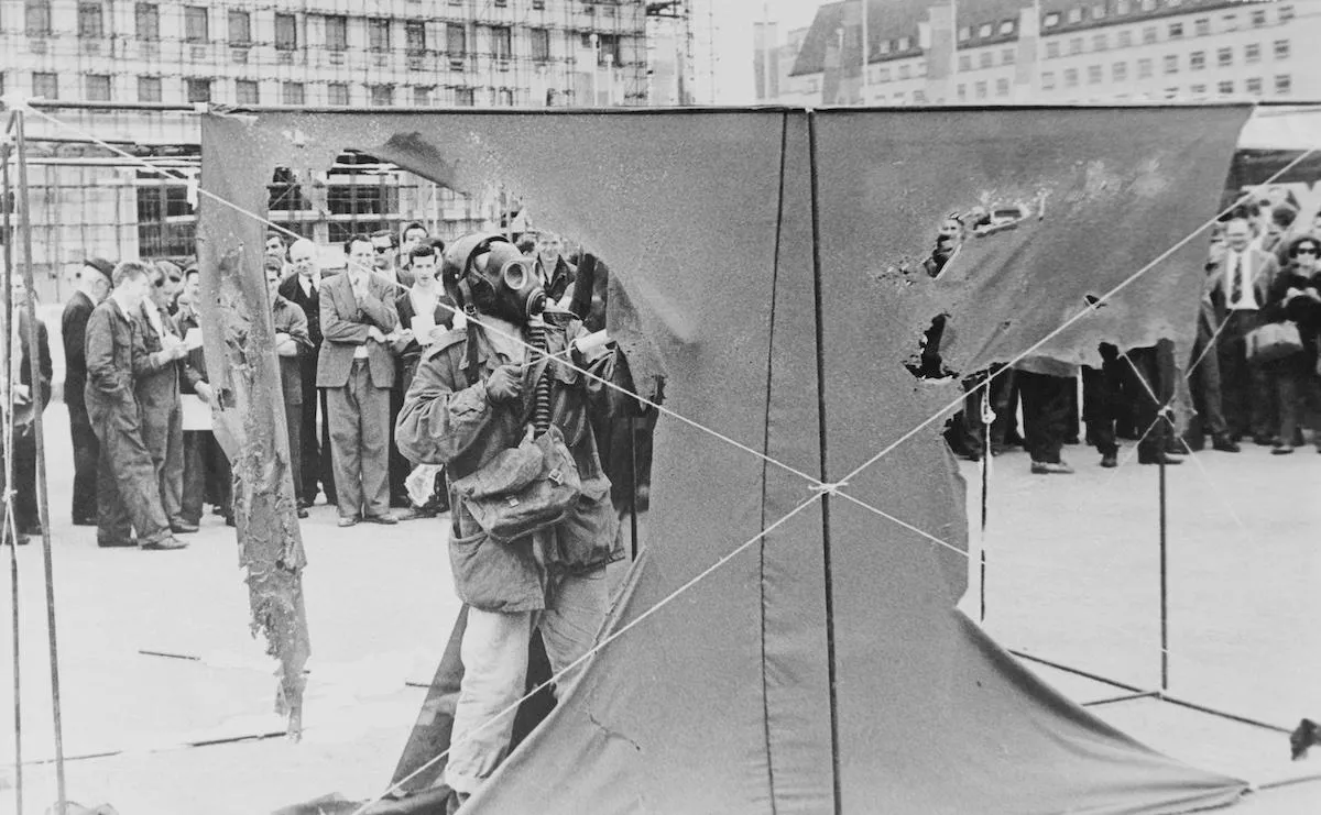 3 luglio 1961, Londra, il molo di South Bank è il palco prescelto. Tre tele celano le rive del Tamigi. Rosso, bianco e nero: gli insoliti colori dell'orizzonte. Il lento scorrere del fiume accompagna l’assieparsi dei passanti sotto un cielo inquieto. La strada è gremita, ma la città sembra diversa. Un uomo fa il suo ingresso in scena, portando con sé un apparecchio respiratorio, ormai obsoleto. Indossa guanti molto spessi e ha il volto coperto da un elmetto militare, da un paio di occhiali protettivi e da una maschera antigas. Con incedere risoluto, si avvicina alla struttura metallica di supporto e applica dell’acido cloridrico sulle tele, utilizzando uno spruzzatore industriale. Interviene da più direzioni, impetuosamente, come se non ci fosse più tempo per aspettare.