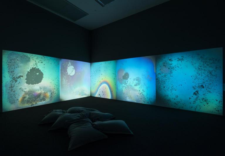 L'opera esposta in questa occasione è Liquid Crystal Environment (1966-2017). L'installazione consiste nella proiezione di immagini iridescenti, realizzate utilizzando uno strato di cristalli liquidi termosensibili, posizionati tra due vetrini microscopici. Sottoposti all'incidenza di una luce bianca polarizzata a temperatura variabile, questi cristalli subiscono delle mutazioni chimiche, corrispondenti a imprevedibili variazioni cromatiche. Un'unità di controllo regola la luminosità della lampada, la rotazione del filtro e la temperatura. Si tratta di uno spazio contemplativo, di un momento di abbandono e riflessione, di un inedito ecosistema generativo. L'interazione dei visitatori diviene necessaria per il raggiungimento di inedite tonalità emotive. La casualità si afferma come un'opportunità di cambiamento (Gustav Metzger, Writings 1953-2016): l'arte autocreativa significa crescita, mutevolezza, movimento. Il fine ultimo è il consolidamento della relazione simbiotica tra pubblico e opera. Liquid Crystal Environment è un'occasione di confronto, rappresenta un mezzo per affrontare il potenziale autodistruttivo insito nella stessa natura umana, un mezzo per proteggerci da noi stessi.