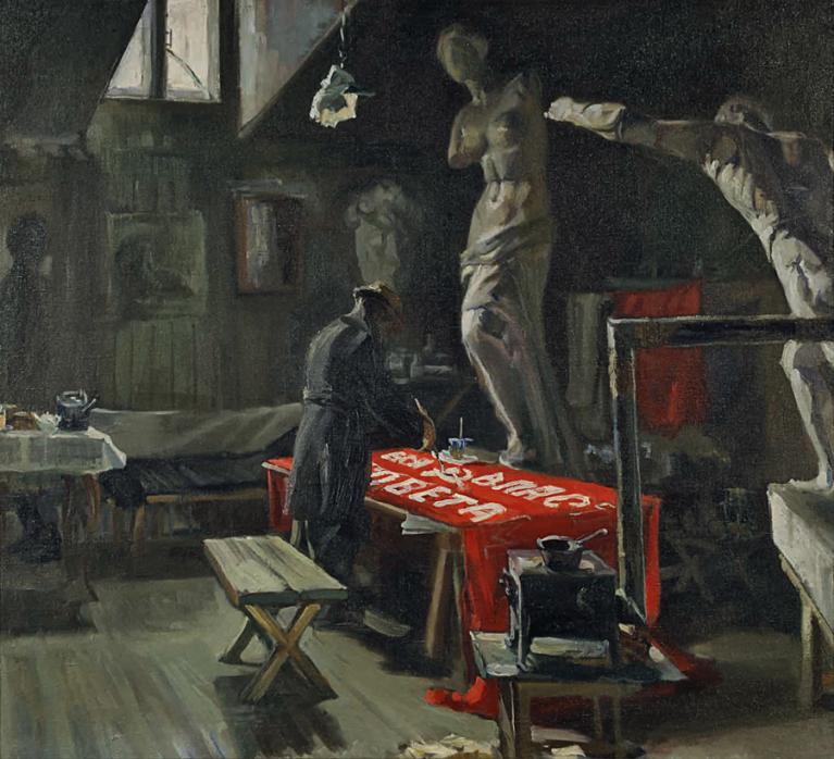 L’artista è Nikolaj Terpsikhorov, un pittore poco noto, che si ritrae mentre lavora al suo nuovo compito e, volgendoci le spalle, ci porta dentro il quadro. Primo Motto è la tela che incontriamo all’ingresso di Revolution: Russian Art 1917 – 1932, la mostra aperta alla Royal Academy di Londra (fino al 17 aprile).