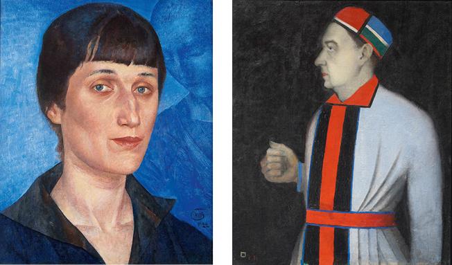 Da sinistra: Kuz’ma Petrov-Vodkin, Ritratto di Anna Achmatova, 1922, Museo di Stato di San Pietroburgo, Photo © 2017, State Russian Museum, St. Petersburg; Kazimir Malevič , Ritratto del Critico d’Arte Nikolaj Punin, 1933, Museo di Stato di San Pietroburgo, Photo © 2016, State Russian Museum, St. Petersburg.