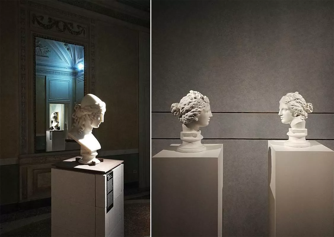 L’altra mostra allestita alla Galleria d’Arte Moderna di Milano (a cura di Omar Cucciniello e Paola Zatti) è dedicata alle “teste ideali” di Canova, ben rappresentate dalla Vestale, che costituisce un modello per la scultura dell’Ottocento e che si spinge fin dentro il Novecento attraverso l’opera di Adolfo Wildt, altro virtuoso dell’arte del marmo. Alla Vestale s’ispira la Vergine scolpita da Wildt nel 1924. In questa scultura il classico si mescola al barocco, al virtuosismo secentesco che trasfigura la pietra in carne con un ossessivo lavoro sulla superficie, come aveva fatto notare Margherita Sarfatti, in una recensione del 1923, riferendosi alla vasta produzione scultorea di Wildt e, in tempi recenti, Paola Mola (catalogo della mostra Adolfo Wildt 1868-1931. Mondadori, Milano 1989). Attraverso la Vergine, esposta nella Sezione 3 della mostra alla GAM, si “vede” il barocco che nell’opera di Canova convive con il neoclassicismo e addirittura con la pittura del Trecento e del Quattrocento, che lo scultore porta nelle sue “teste ideali” attraverso la letteratura. È il caso dell’opera in gesso Beatrice esposta nella Sezione 4. Un incrocio di sguardi che si chiude perfettamente con l’opera Mimesi realizzata dall’artista Giulio Paolini nel 1975, composta da due copie in gesso della testa dell'Hermes di Prassitele, collocate in modo che lo sguardo di una rinvii a quella dell’altra. Uno sguardo rivela l’altro, così come lo sguardo di Wildt alla GAM rivela lo sguardo barocco, oltre che neoclassico e romantico, di Canova. Alla GAM, così come a Gallerie d’Italia – Piazza Scala, tutto è un incrocio di sguardi lanciati da spazi e tempi diversi.