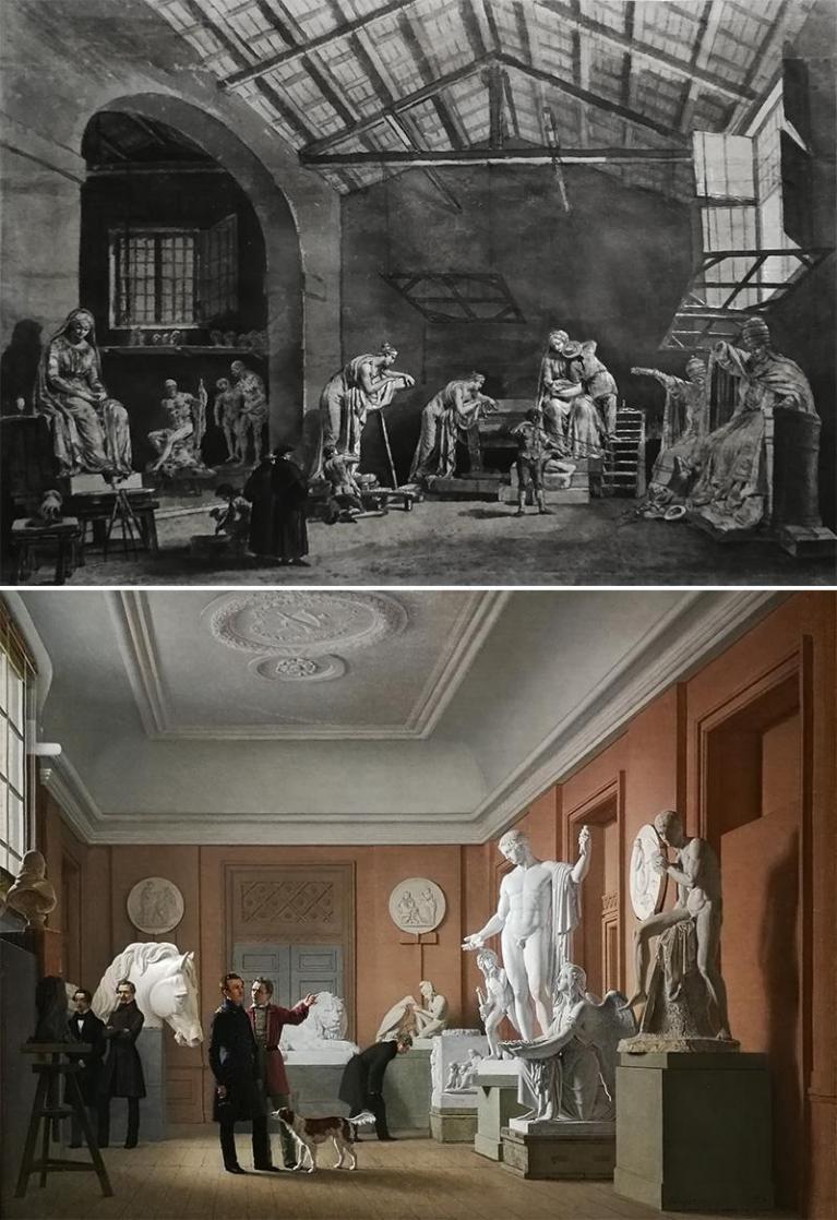 Lo studio di Antonio Canova a Roma in un disegno a penna e inchiostro acquarellato eseguito da Francesco Chiarottini nel 1785 circa. Udine, Civici Musei, Gabinetto Disegni e Stampe del Castello / Lo studio di Bertel Thorvaldsen a Charlottenborg in un dipinto eseguito da Johan Vilhelm Gertner nel 1839. Copenhagen, Thorvaldsen Museum.