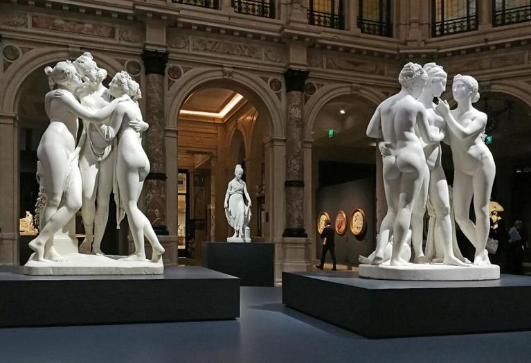 Nella grande sala centrale di Gallerie d’Italia – Piazza Scala si è voluto dar prova di queste differenze con un confronto, mai tentato prima, fra i due celebri gruppi marmorei: Le tre Grazie di Canova e Le Grazie con Cupido di Thorvaldsen, attraverso i quali i due scultori hanno espresso la propria concezione della “bellezza ideale” teorizzata da Johann Joachim Winckelmann nel Settecento e ancor prima da Giovanni Pietro Bellori, che individuò nella scultura – soprattutto – l'arte dove la natura si unisce all'Idea che alberga nella mente dell'artista (L’ Idea del Pittore, dello scultore e dell’Architetto in Le vite de' pittori, scultori et architetti moderni, Roma, 1672).