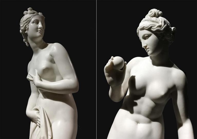 Antonio Canova, Venere, 1817-1820. Leeds Art Gallery / Bertel Thorvaldsen, Venere vincitrice, 1805-1809 (Lituania, Nacionalinis Mikalojaus Konstantino Čiurlionio dailės muziejus). Nella comparazione visiva qui proposta è evidente come il comportamento della luce sulle superfici del marmo lavorato da Canova si differenzi da quello sulle superfici del marmo lavorato da Thorvaldsen.