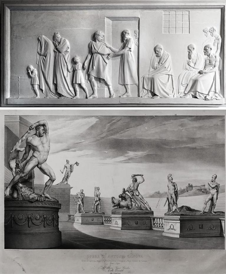 Antonio Canova, Socrate congeda la propria famiglia, 1787-1790. Gallerie d’Italia – Piazza Scala, Milano Collezione Fondazione Cariplo / Michele Fanoli, Opere di Antonio Canova. Soggetti eroici in un’arena, 1842. Milano, Biblioteca Nazionale Braidense.