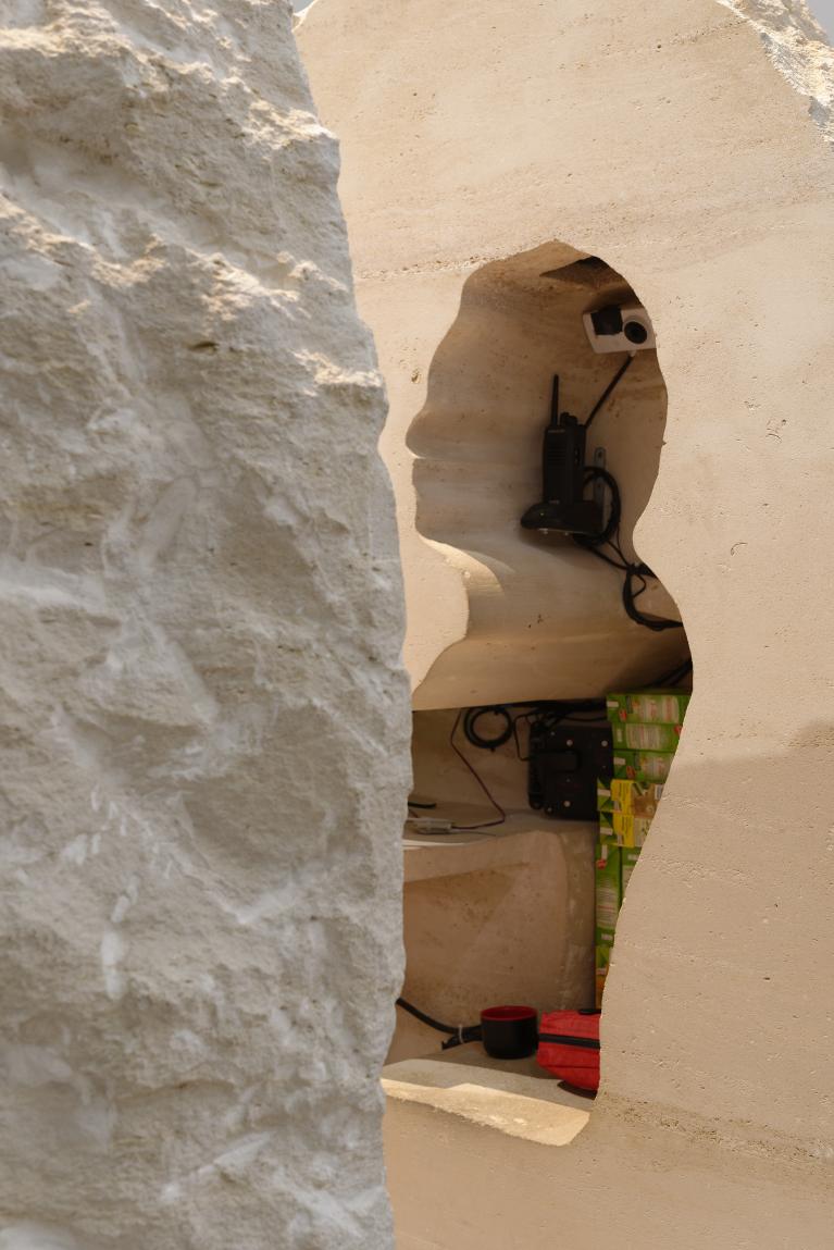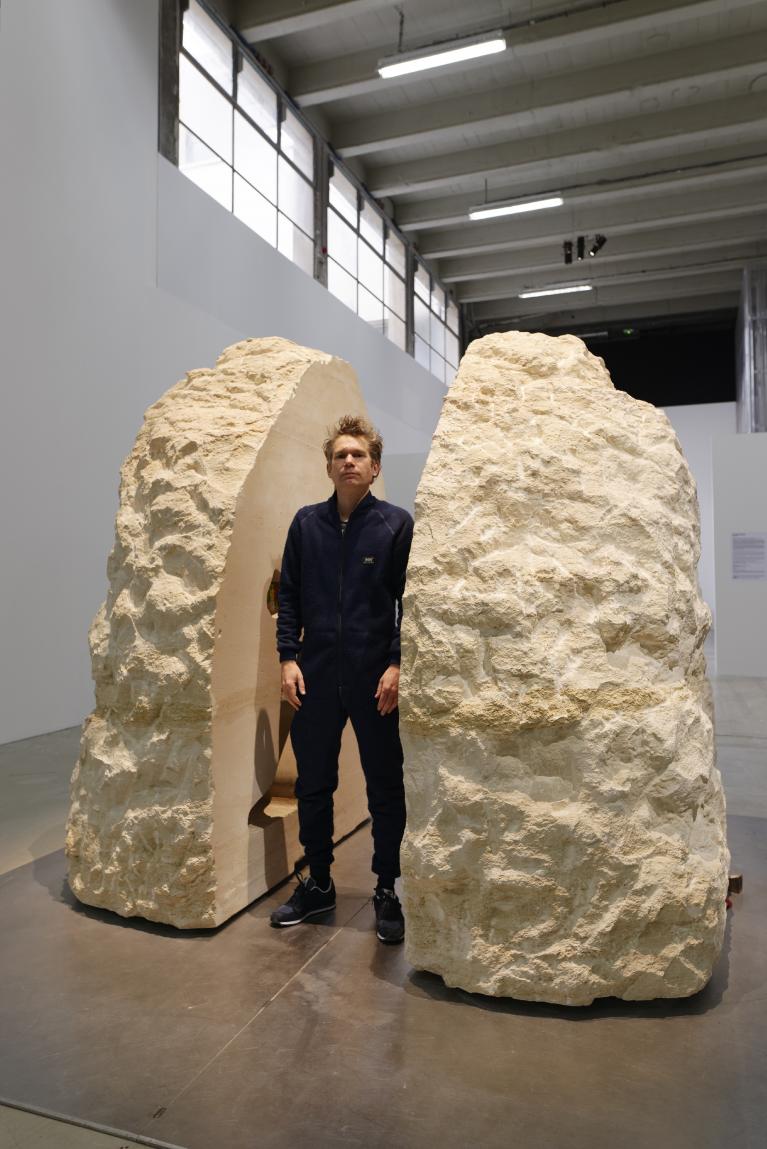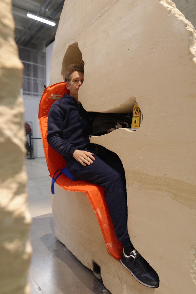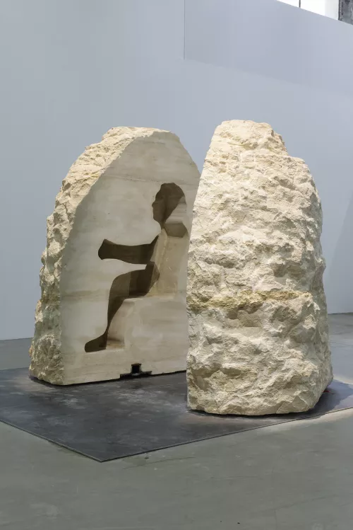 Le performance di Poincheval richiedono una lunga fase di preparazione in cui vengono affrontate questioni logistiche quanto psicologiche perché, è evidente, queste azioni renderebbero folli la maggior parte di noi dopo pochi istanti. Astenersi claustrofobici, insomma. I margini di movimento all’interno della pietra sono risicati, il campo visivo limitato a pochi centimetri dal naso. I visitatori possono farne esperienza diretta ora che Poincheval, abbandonata la pietra, l’ha lasciata aperta in due come un melone, ora che la silhouette dell’artista ne cristallizza in negativo la presenza.