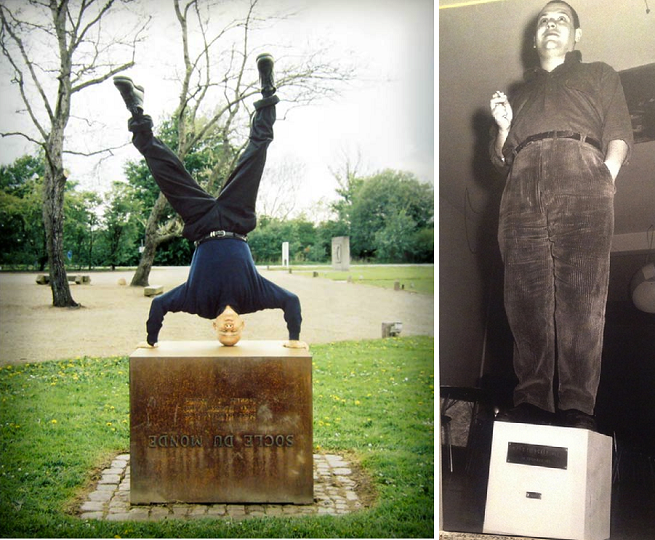 Sembra dunque che l'artista scompaia dietro il suo capolavoro. Ma se capovolgessimo nuovamente il punto di vista? Qualche anno fa l'artista brasiliano Cildo Meireles (le cui installazioni erano in mostra all'Hangar Bicocca lo scorso luglio) ha proposto una sua reinterpretazione, altrettanto semplice e poetica, del Socle di Manzoni: si è messo a testa in giù sopra il Socle e ha intitolato la perfomance “Atlante” (Atlas, 2007). Basta guardare la fotografia rovesciata per vedere in effetti un Atlante, coi piedi piantati nel nulla, che sorregge il piedistallo su cui poggia il mondo. Ma è l'artista che, issandolo sulla sua fantasia, fa la fatica di rendere “magico” cioè “artistico” il mondo o è il peso del mondo che conferma l'eccezionalità esibita dall'artista?