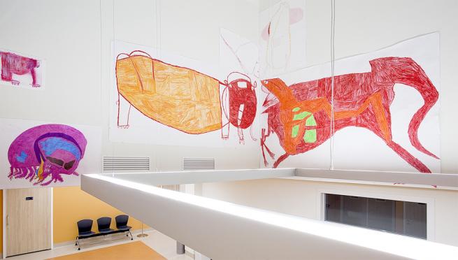 Il Lefante che vede una donna e aveva vergogna litiga con il Ceraphris Ornata nel cavedio del reparto di Medicina Nucleare, Clinica Humanitas Gavazzeni, Bergamo.
