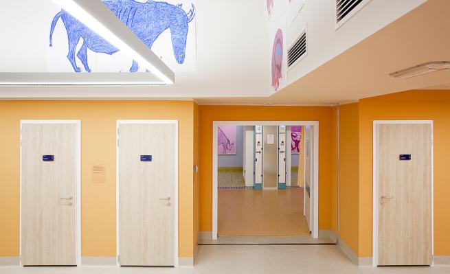 Il Rinoceronte Inbirinto passeggia sull’impianto di illumimazione all’ingresso dei bunker della Radioterapia, Clinica Humanitas Gavazzeni, Bergamo.