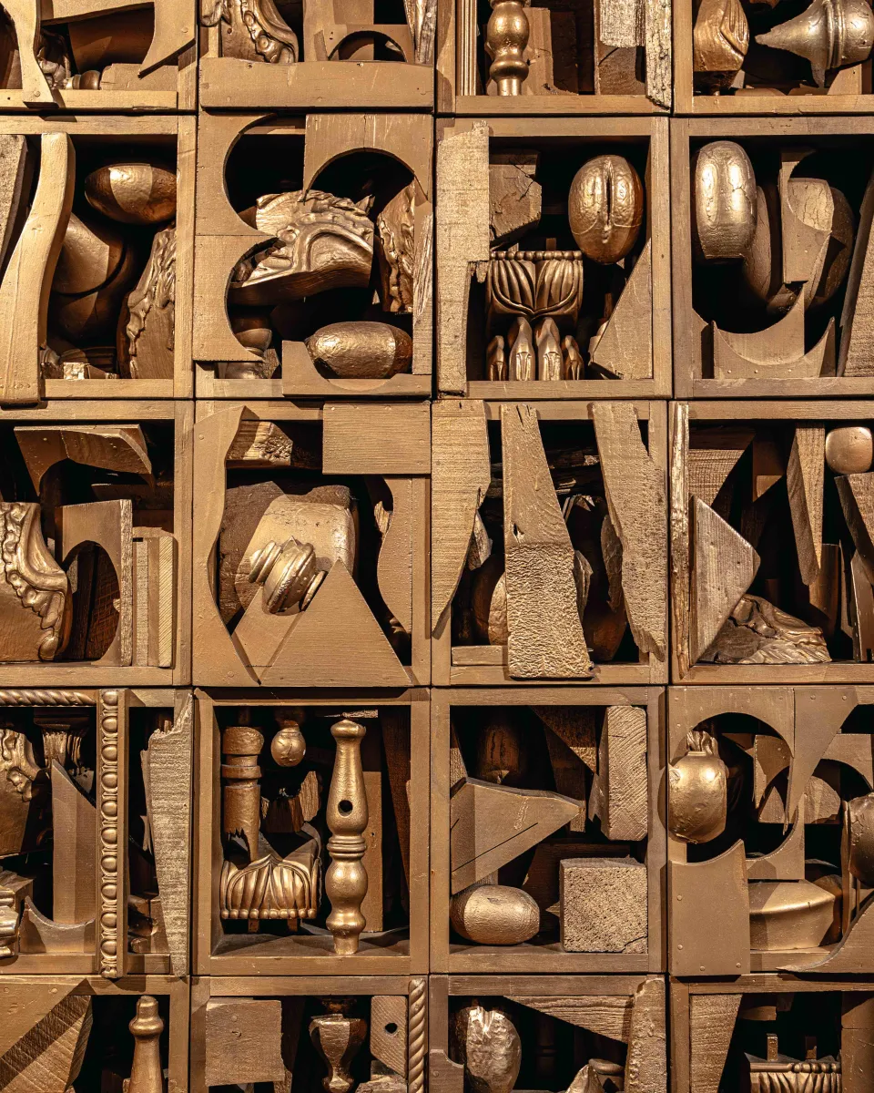 Nel 1963 Renato Barilli parla nel suo caso di un assemblage “squisito”, termine che va preso nel senso letterale di “ricercato”, scelto con cura, per un criterio di vicinanza tra elementi che sentono “di appartenere a una stessa famiglia”. Più che santificare il reperto quotidiano le potenti scansie di Nevelson vogliono raccontarcene lo stupore e il mistero, quasi fossero delle nuove Wunderkammern, le “camere delle meraviglie” che tra il Cinquecento e il Settecento raccolgono le curiosità naturali e artificiali e ne fanno un primo esempio di museo. Sui loro ripiani i visitatori costruivano corrispondenze personali, curiose, persino cosmologiche tra gli elementi, a seconda del loro sguardo o del gusto del collezionista.