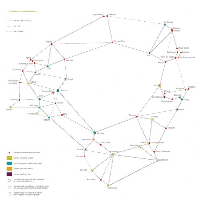 Abbiamo cercato di creare una trama in cui intrappolare i punti di interesse fisico, sociale e culturale, che avrebbe conferito valore alle cascine stesse, dimostrando così che non si tratta di relitti di un passato immobile e immutato, ma che, messe a sistema, possono diventare organismi che partecipano alla realtà cittadina, rispettano il nuovo linguaggio urbano e si configurano come strumento in mano alla cittadinanza.  La costituzione della rete conduce verso la consapevolezza di trovarsi di fronte a presenze molto diverse tra loro, ma capaci di dialogare con il contesto che le circonda. In quest’ottica svolge un ruolo fondamentale la percezione dei rapporti e delle connessioni. Ci permette di cogliere le relazioni esistenti tra una cascina e l’altra e spinge il cittadino a comprendere la complessità del tema, incuriosendolo nella ricerca di tutti i canali di dialogo esistenti tra queste splendide presenze. La rete è costituita su più livelli, fisici e intangibili: da una parte le piste ciclabili e i corridoi ecologici e dall'altra le varie funzioni correlate e combinate tra loro che rendono imprescindibile il dialogo tra le cascine.