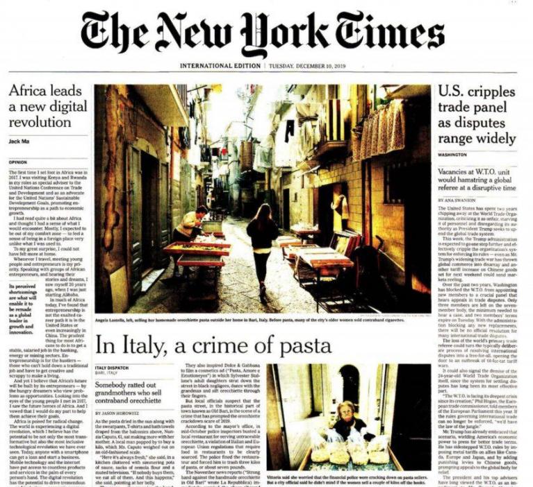 Le anziane signore – è opinione sempre più diffusa anche tra i giornalisti – sarebbero l’ultimo argine all’impeto omologante dell’industria pastaia, ma pure alla globalizzazione, all’Unione Europea, alla psicosi da eccesso di pulizia, alla dipendenza da smartphone dei nipotini, al degrado dei costumi alimentari, alla gentrificazione del centro storico, ai centri commerciali in periferia e, ovviamente, alla corruzione dei costumi alimentari patrii. «Talvolta è l’irregolarità – riporta il NYT con un amabile, quanto metafisico, doppio senso – a fare le cose belle».