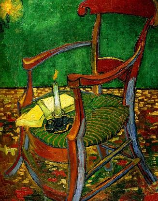Artaud insiste sull’alone viola degli staggi della poltrona, pronto forse ad assalire la paglia verde del sedile, a far cadere la candela accesa appiccando così il fuoco nella stanza e, per esteso, alla pittura. Van Gogh, che una notte dell’inverno 1889 uscirà con dodici candele accese fissate a corona sul cappello per dipingere il paesaggio, riserva qui a Gauguin questo sostituto del sole; sulla sua poltrona sistemerà la pipa spenta e il cartoccio di tabacco.