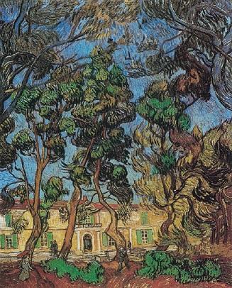 8 maggio 1889, van Gogh entra all’ospedale Saint-Paul de Mausole (Saint Rémy de Province). Dipinge questo ex-monastero come un luogo di villeggiatura: tra gli alberi in primo piano si scorgono le mura paglierine baciate dal sole, le persiane verdi e gli stipiti bianchi delle finestre, le colonne porpora dell’ingresso, la facciata linda. Di tutti questi alberi bisogna però diffidare: basta osservare un altro dipinto in cui la vegetazione lussureggiante, dall’erba alle piante rampicanti sul muricciolo, si tinge di un rosso vinaccia. La figura che passeggia sul prato appare d’improvviso in pericolo, travolta da un momento all’altro da un’onda anomala.