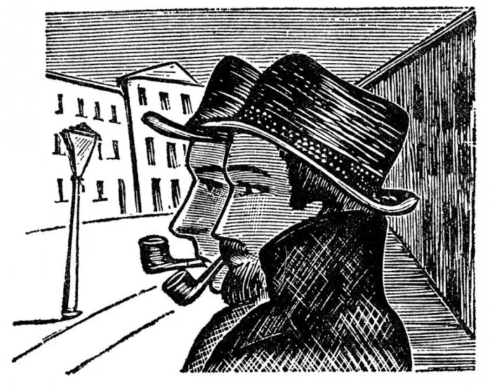 In copertina, Disegno da Il libro delle pipe di Dino Buzzati e Eppe Ramazzotti. I due autori.