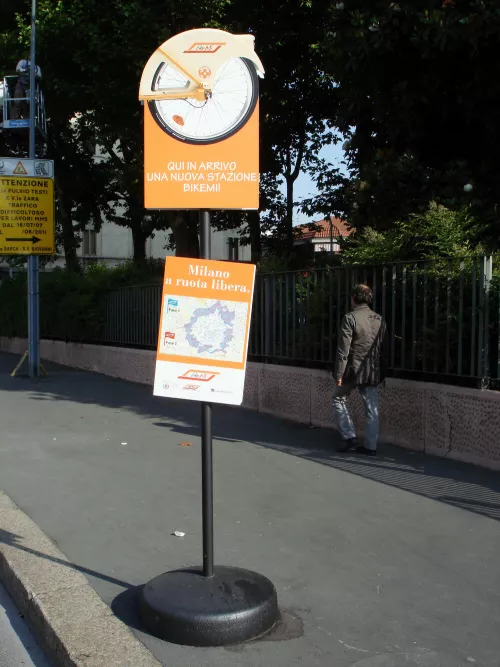 Ancora più oltre, sorpassata una grande piazza, in una via sempre molto trafficata, proprio di fronte all’ingresso di un noto palazzo pubblico della città, è improvvisamente comparsa una palina dalla forma superiore arrotondata, a mo’ di ruota di bicicletta. La palina annuncia che tra pochi giorni lì sorgerà un’area di sosta (la n… esima) per il bike sharing. Sullo sfondo degli squillanti colori araldici dell’azienda dei trasporti cittadina è formulata la solenne promessa di un radioso futuro ciclabile.