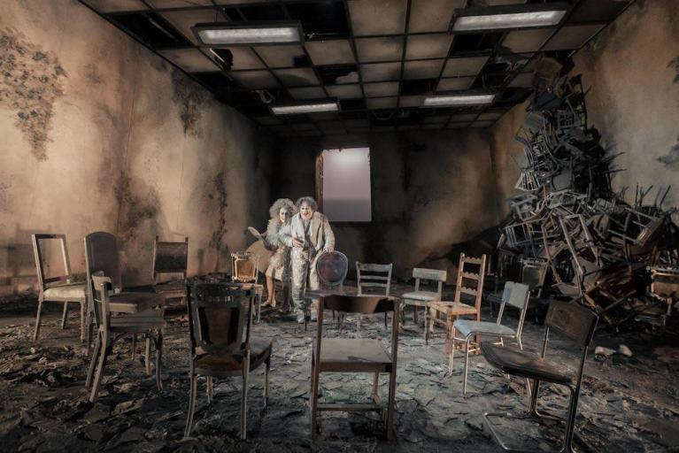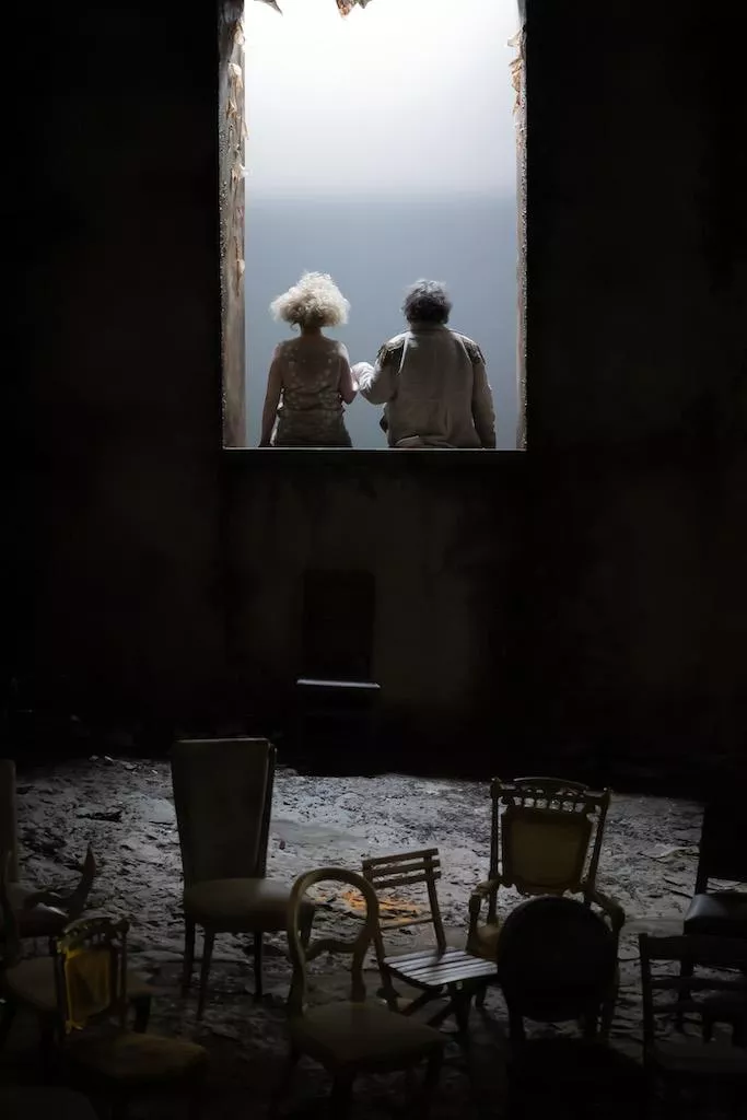 Qui parlerò delle Sedie (1952) di Eugène Ionesco, nell’allestimento del Teatro Stabile di Torino, nella traduzione di Gian Renzo Morteo, con la regia di Valerio Binasco, la scena e le luci di Nicolas Bovey, i costumi di Alessio Rosati, le musiche di Paolo Spaccamonti. Ho lasciato per ultimi quelli che sono la vera chiave di volta dello spettacolo, insieme allo spazio scenico incombente e in rovina, uno stanzone asfittico, sconnesso, pieno di crepe, che si apre solo sul fondo in una finestra che dà su una porzione di inconsolabile cielo azzurro. Danno vita particolare a questo lavoro i due interpreti, Michele Di Mauro e Federica Fracassi, nei panni di un vecchio e di una vecchia guardiani di quel faro fuori dal mondo, dove una catasta di sedie simile a instabile torre fa intendere che una volta là si è svolta qualche forma di vita.