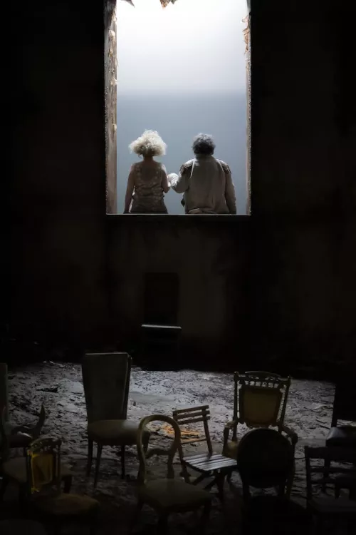 Anche nelle Sedie da una situazione terminale si aprono le cateratte del rimpianto acre, condite in questo allestimento da rumori di vento o di mare in tempesta, che fanno immaginare di trovarsi in un luogo isolato, dove il resto dell’umanità entra solo attraverso la fantasia, il desiderio, l’assenza di vita. I due protagonisti sono due vecchi dal trucco caricato e dall’abbigliamento dimesso. Si muovono con fatica; spesso sostengono il balbettare spezzato dei reciproci passi appoggiandosi, avvinghiandosi, rifugiandosi tremebondi nell’altro e nell’altra. Hanno un passato oscuro e mediocre e si proiettano in sogni di grandezza o perlomeno di una vita decente per il futuro, infranti in atmosfere sempre sinistre, inquietanti. Lui vorrebbe ritrovarsi tra le braccia rassicuranti della mamma e quella fragile vecchia che si trova dinnanzi deve fargli da moglie e da madre.
