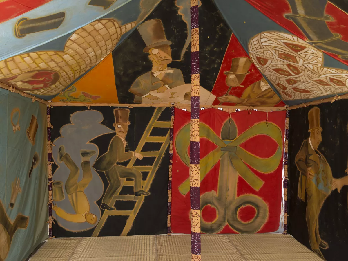 In copertina, Tenda del diavolo, 2013-2014 (particolare, interno), Tempera su cotone, ricamo, cuciture a mano, pali di bambù, finali in legno, corde, pesi in ferro, cm 600 x 400 x 300, Collezione dell’artista. Foto John Berens. Courtesy Francesco Clemente Studio.