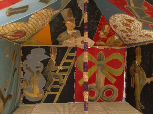 È nelle grandi sale del piano nobile del Palazzo delle Esposizioni che Francesco Clemente ha eretto un inedito insediamento, col quale «letteralmente mi accampo nel cuore di Roma». Maestose tende, dalle imponenti dimensioni, occupano completamente lo spazio espositivo, creando una inconsueta atmosfera e un singolare panorama. Tende e atmosfera che sospingono alla contemplazione, alla pausa, all’immaginazione. Realizzate tra il 2010 e il 2014, in collaborazione con una comunità di artigiani nel Rajasthan e prodotte in una fabbrica che in precedenza produceva tende per l’esercito indiano, ciascuna di ben m 6 x 4 x 3. Ognuna di loro si lascia attraversare, vivere, ammirare, girare intorno, per coglierne dettagli, frammenti, simboli, narrazioni. Perché «la tenda rappresenta la fuga. La fuga dalla meccanicità della vita, dai condizionamenti e dai falsi doveri che ci vengono imposti». Una grande installazione, in cui le tende sembrano piuttosto pagine di un personale diario, sulle quali si condensano suggestioni, esperienze, appropriazioni, elaborazioni, sapere e conoscenze. E le parole si trasformano in immagini e rappresentazioni.