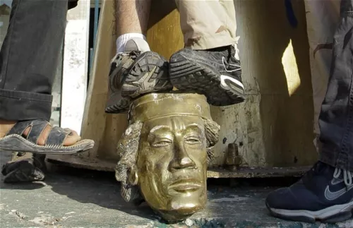 Le teste rotolano. A ogni rivoluzione i rivoltosi e i rivoluzionari si avventano sui simboli del passato regime: abbattono statue, rovesciano monumenti, sbriciolano emblemi e insegne. Ma è dalla metà del XX secolo che le sculture marmoree o bronzee dei capi sono state deliberatamente prese d’assalto, colpite e ridotte a terra. E non solo quale opera di iconoclastia del vecchio potere, ma come effettiva azione sostitutiva dell’aggressione al corpo stesso del re, del tiranno o del despota. La statua di Mu’ammar Abu Minyar ‘Abd al-Salam al Qadhdhafi, meglio la sua testa dorata, giace ora a terra in una evidente decapitazione in assenza, per il momento, del suo corpo fisico.