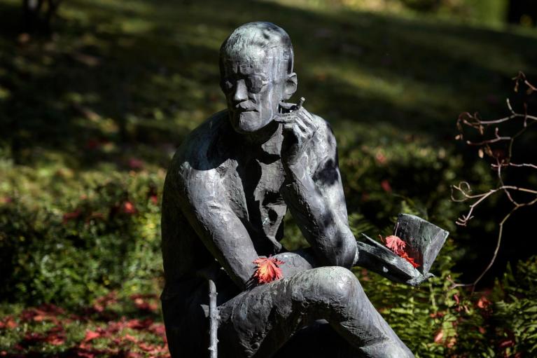 La tomba è una semplice lapide rasoterra, contornata da un cespuglio, e dietro il cespuglio sorge una statua di bronzo con i tratti del nostro autore. Corpo magro e dinoccolato, accartocciato su se stesso in un rilassamento pensoso, con gambe accavallate, mento appoggiato a una mano con sigaretta tra due dita, Joyce guarda verso il cespuglio alla sua destra. Si direbbe un uomo snodabile che sta pensando a una acrobazia da compiere, mentre arrivano dei visitatori a rendergli omaggio come grande acrobata letterario, dopo aver visitato lo zoo dietro l’angolo.