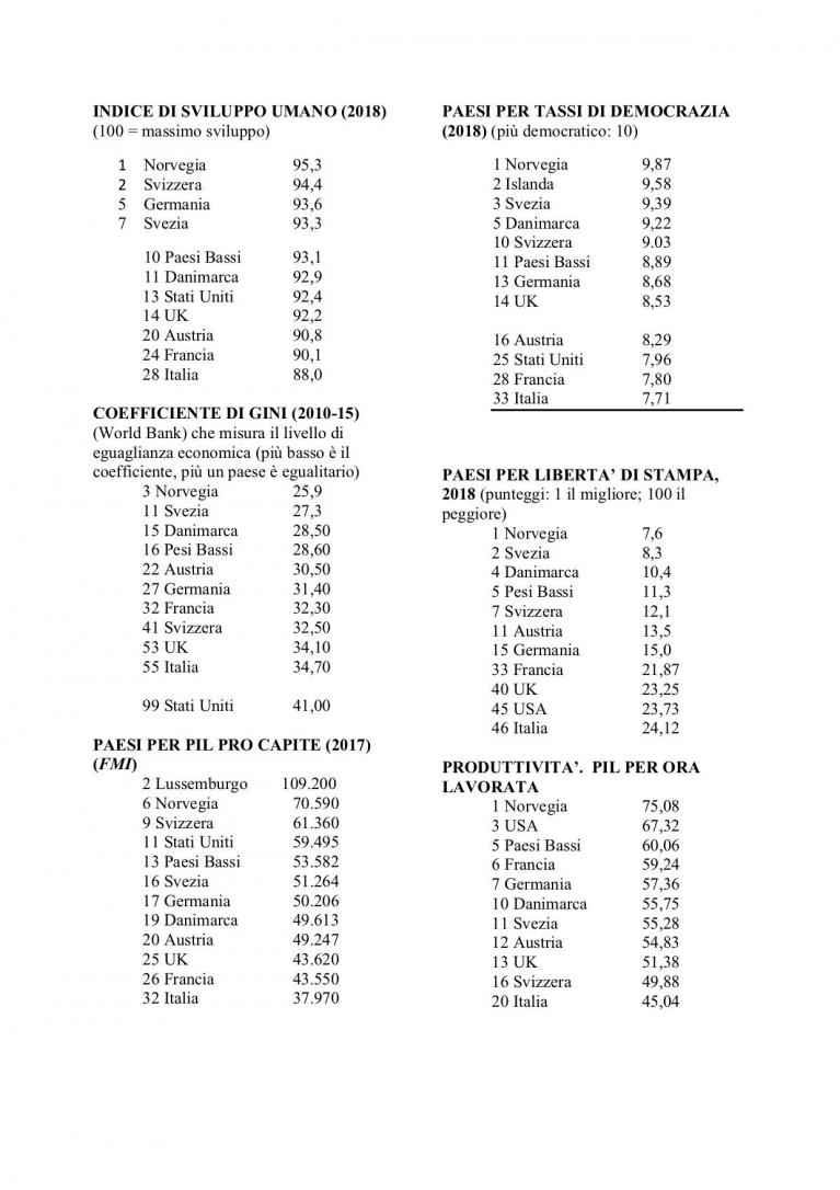 Riporto qui una serie di classifiche che riguardano gli aspetti che determinano quella che si chiama qualità della vita di un paese. Non una classifica della felicità, ovviamente, non esistono paesi felici, ma paesi migliori di altri sì. Li chiamerò “i virtuosi”. E in effetti per tutte queste voci i paesi europei di lingua germanica (dato che annoverano anche nazioni del Sud come la Svizzera tedesca e l’Austria) mostrano una decisiva virtuosità. Nella classifica inserisco anche l’Italia e, dato che sono paesi idealizzati da molti, anche gli Stati Uniti d’America e la Gran Bretagna (UK). Ho inserito la Francia come altro paese importante di riferimento.