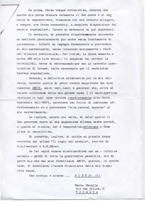 Il 27 novembre 1997 Peppe Dell’Acqua e Franco Rotelli hanno invitato a Trieste, alla sala Tripcovich, diversi amici di Franco Basaglia fra cui Luigi Pintor, Gino Paoli, Alfredoo Lacosegliaz, Freak Antoni. Chi ha cantato, chi detto, chi ha fatto. Io ho scritto la Lettera ai cavalli di Trieste e l’ho letta. Fuori, sull’ingresso, c’era Marco Cavallo.