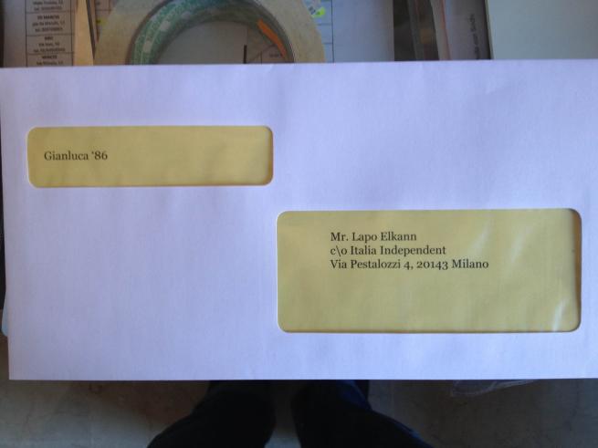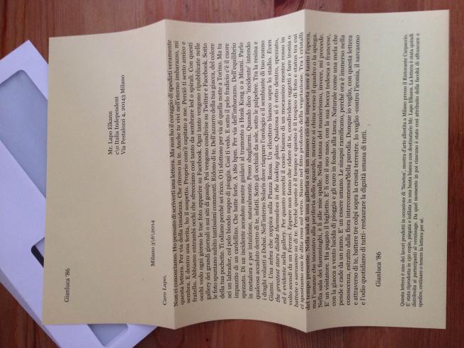 Post Scriptum: Questa lettera è uno dei lavori prodotti in occasione di 'Newton', mostra d'arte allestita a Milano presso il Ristorante Carpaccio. È stata riprodotta in 150 copie, piegata e infilata in una busta bianca con destinatario Mr. Lapo Elkann. La lettera è stata quindi distribuita ai partecipanti al vernissage. Da quel momento in poi ciascuno è stato così attribuito della facoltà di affrancare e spedire, cestinare o tenere la lettera per sé.
