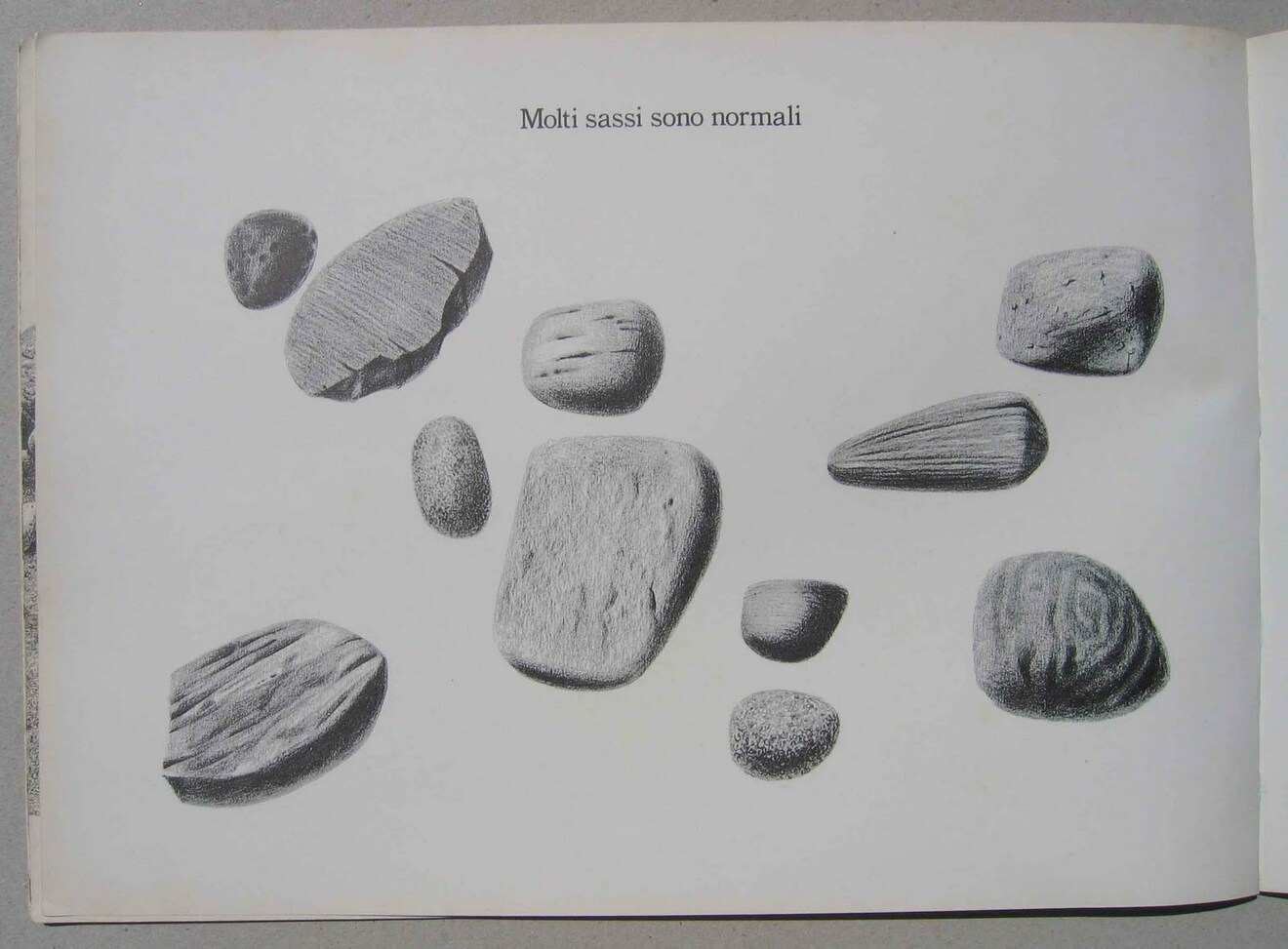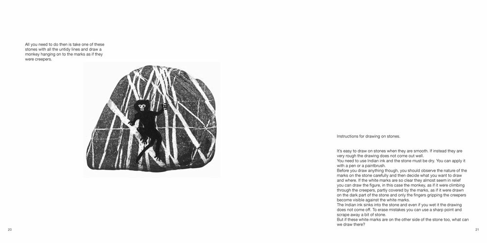 E segnalare le difficoltà di chi per sventatezza o gioco, attraverso il segno o la parola, si trova a esercitarlo come arte della relazione fra il fuori e il dentro. Munari, ad apertura di libro afferma: «Dobbiamo ritenerci fortunati quando ci troviamo a passare una vacanza in una località dove si trovano tanti sassi...» e continua, enumerando i diversi tipi di sassi che si possono trovare. L'elenco immediatamente istituisce, nell'informe costituito dalla spiaggia di sassi che vediamo ad apertura di libro, la regola del numero e del nome. Nomi di località: Levanto, Baratti, Gargano, Elba. E tipi di sassi: quelli di ferro, quelli con le venature, pezzi di stalagmiti o di stalattiti... Qui, fra le righe, e attraverso un percorso istituito da parole e immagini rigorosamente fotografiche, si instaura un principio formale che di una spiaggia di sassi, in cui vediamo l'umano muoversi a fatica, fa una collezione, un catalogo. Grazie alla pratica dell'osservazione sistematica, grazie alla distanza e alla relazione instaurate dal linguaggio, l'intelligenza può cominciare a formarsi come cultura, lettura del mondo.