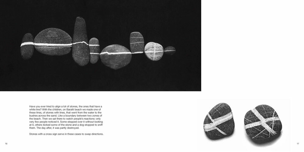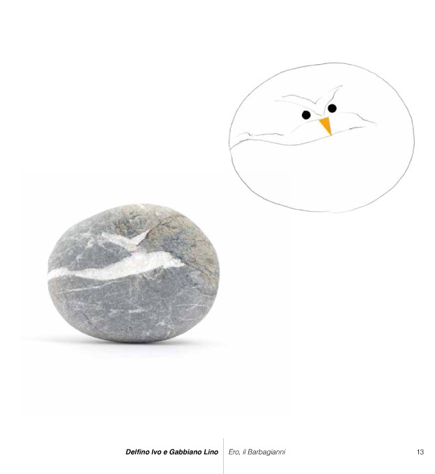 Il lettore è chiamato, dapprima a mettere a fuoco attraverso i segni sui sassi le presenze che li abitano, in seguito, a dare loro corpo sulla pagina del libro, attraverso un intervento grafico personale. Il libro è completato dalle istruzioni per una mostra da tavolo, da realizzare grazie ai piedistalli e ai sassi fustellati allegati. In questo modo il passaggio dall'informe della spiaggia alla soggettivazione del sasso attraverso immagine e parola è compiuta.