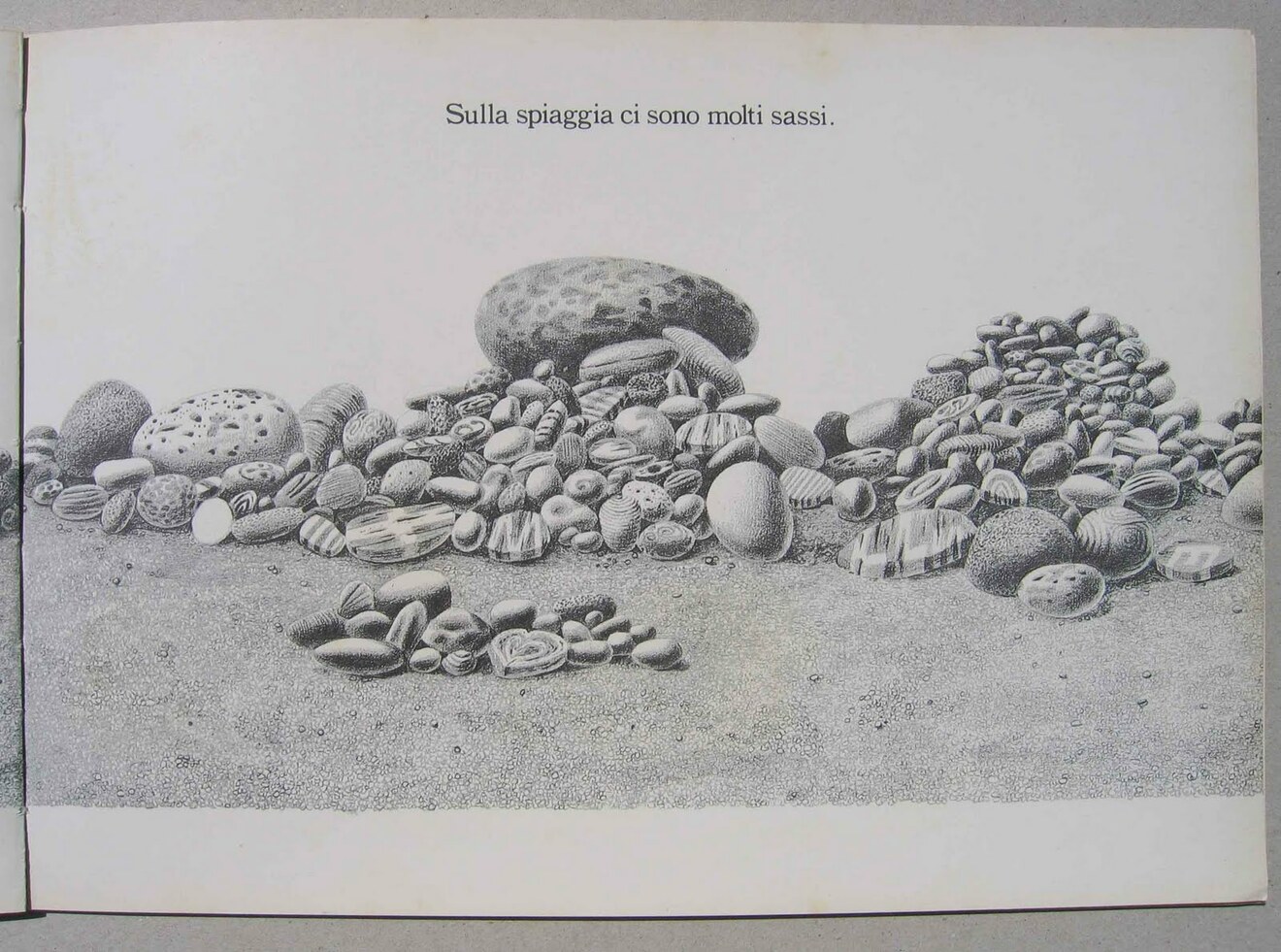 Il capostipite dei libri illustrati dedicati ai ciottoli è Nella spiaggia ci sono molti sassi, di Leo Lionni, del 1961. Anch'esso si apre con la visione di una distesa di sassi, tuttavia non indifferenziata, perché la pratica del disegno adottata da Lionni per discorrere con il lettore, genera qui fin dalle prime battute un principio di ordine. Qui, ogni sasso parla già la lingua del soggetto e a chi lo osserva comunica il piacere della enumerazione, benché silenziosa. Il lettore è chiamato alla necessità della parola fin dalla prima pagina. Che sia questa la preoccupazione e la poetica di Lionni, lo si evince dal gioco che istituisce fin dal frontespizio dove a sassi possibili si mescolano sassi immaginari, oltre a due sassi su cui appaiono un numero, 8, e una lettera, A. Il gioco a cui chiama Lionni è quello di riconoscere i principi d'ordine attorno ai quali l'occhio può organizzare il disordine. In molti casi, si tratta di principi fantastici, ovvero immaginari e non perché l'immaginazione sia svincolata dalla realtà, ma perché l'intelligenza umana costruisce percettivamente e cognitivamente la realtà attraverso la pratica della lettura che, di ogni cosa, fa un segno.
