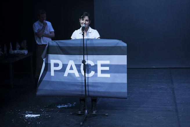 Sara Bonaventura e Claudio Cirri, con Matteo Angius della compagnia Accademia degli Artefatti a chiudere la triangolazione inquisitoria, sono tre pubblici ufficiali venuti a controllare la titolarità dei biglietti di viaggio della nostra sopravvivenza Prima, Durante e Dopo un ipotetico terzo conflitto mondiale. Nel loro continuo saliscendi tra la platea e la scena, ci colgono, manco a dirlo, impreparati, goffi, ridicoli, perché ormai diamo la pace per scontata e la guerra è solo immagini in azione sui giornali, in televisione, su Internet, a teatro: è immaginazione.