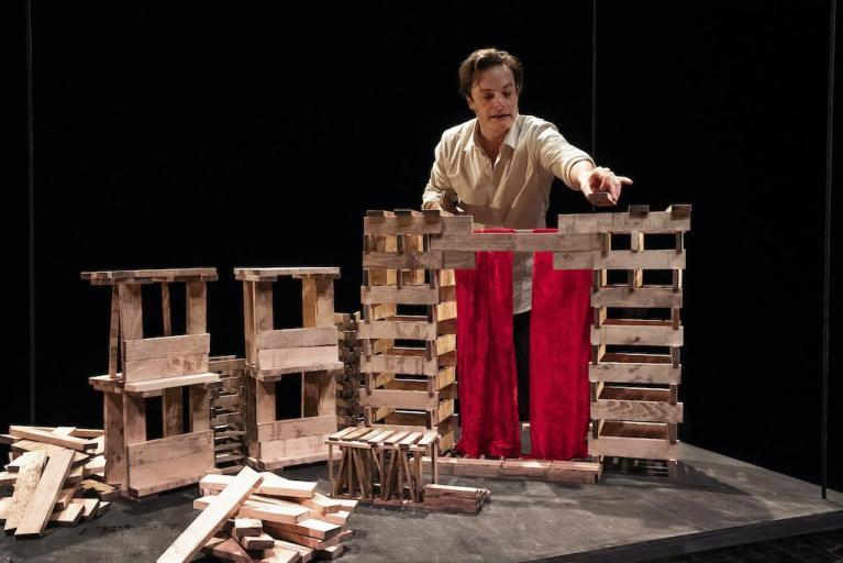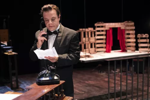 Sul palco del San Ferdinando, legata a delle funi, è sospesa una sottile piattaforma di legno a mezz’aria. Sopra c’è un modellino in miniatura di una struttura in costruzione. Lino Musella, pantaloni neri e camicia bianca, ha un barattolo di colla e un pennello tra le mani. Si rivolge a “Vittò”, immaginario aspirante attore – e al pubblico – mentre incolla pezzi. Sembra il primo atto di Natale in casa Cupiello, ma le parole sono altre: Lino Musella/Eduardo racconta del San Ferdinando: di quando acquistò quel mucchio di pietre bombardate, dei milioni cacciati di tasca sua per tirarlo su, di quanto sarebbe diventato bello e moderno, questo teatro, pensato prima di tutto per il popolo e per gli artisti, con l’aiuto di Peppino Mercurio, suo epico capo macchinista, tanto da far invidia a tutti i teatri europei. Le sue parole risuonano in sala con un’ammirazione solenne, mista a un orgoglioso senso di rivalsa, come a volere riparare un torto subìto: a distanza di quasi ottanta anni.