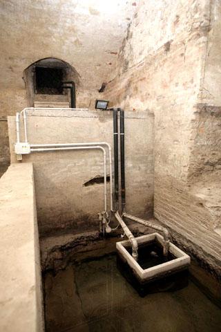 È evidente che, data l’umidità regnante, le finestre a bocca di lupo che a livello del pianterreno della cappella illuminano la cripta sono lasciate senza vetri (in caso di piogge eccezionali hanno convogliato e riversato l’acqua che ristagnava intorno ai muri esterni della cappella dentro la cripta). Per inciso: le grate bucherellate che circondano il profilo dei muri perimetrali della cappella sono evidentemente inadeguate e anche questo sistema di smaltimento della pioggia andrebbe rivisto.