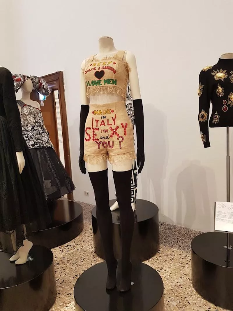 Ed è proprio Instagram a far parlare l’istanza collettiva dei visitatori, aggregata tramite l’hashtag #italianaexhibition, grazie a cui possiamo risalire agli oggetti in mostra più impattanti: oltre al diorama citato in apertura, troviamo un outfit di Versace caratterizzato dalla stampa barocco riportata in auge nella recentissima collezione tributo, il completo crop top e short di Dolce&Gabbana con la macrostampa “Made in Italy”, e l’opera “Tutto” (1992-94) di Alighiero Boetti, uno zibaldone coloratissimo dove impera la diversità che acquisisce senso nel montaggio di vari elementi, uniti da una comunicazione dinamica.