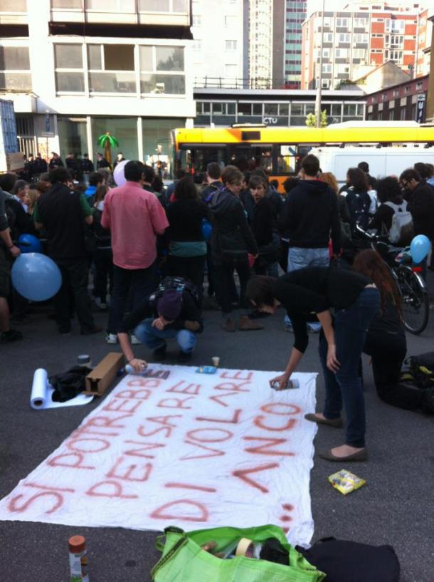Ore quattordici: ci sono i vari tavoli: logistici, organizzativi, di Radio popolare. All'assemblea, momenti di dibattito sul che fare si alternano interventi pubblici. Tra poco sono previste performance teatrali: in pratica Macao è nella strada e il programma previsto per oggi si attua così, seduti in cerchio sull'asfalto.