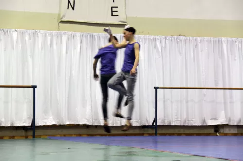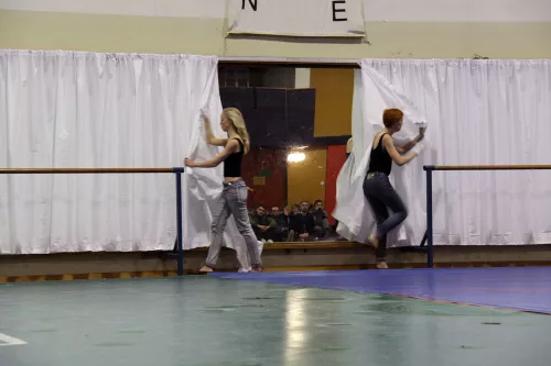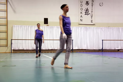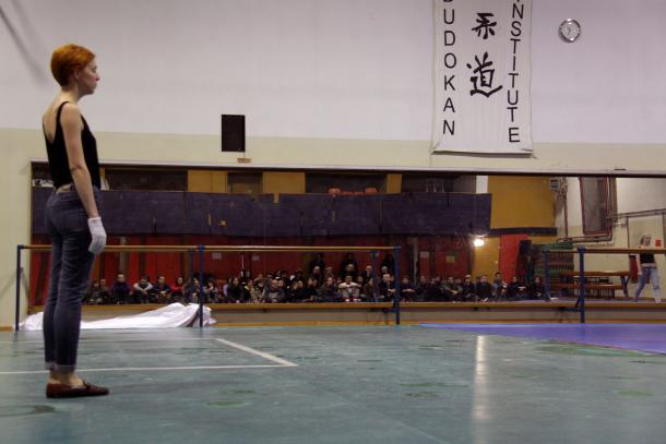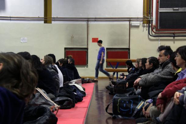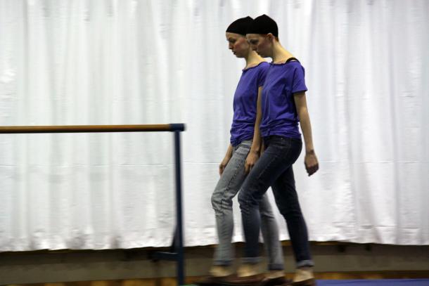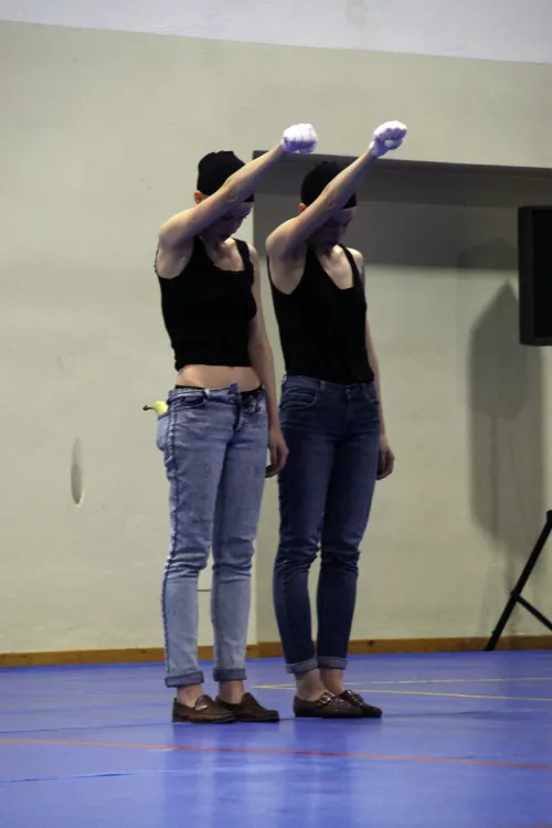 Sin dal titolo Monkey see, Monkey do adombra il tema di un a-due inteso come figura specchiante guardata e guardante. Il doppio – scampato alla facile declinazione della materia gemellare – vale qui come specchio deformato di un’alterità irriducibile, che s’insinua nell’osservazione delle minime discordanze tra i due corpi e i loro movimenti. Quello che Giorgia e Muriel – t-shirt blu, cuffietta e canotta nera, jeans, mocassini mogano – fanno è essenzialmente camminare. La loro retorica pedestre è circolare. Ridondante, ma non montante. La sequenza-camminata, inscritta nel verde-blu della palestra, si ripete uguale/simile/differente fino alla fine. Il loro incedere è un perdersi e incontrarsi in un continuo déjà vu, scandito dal ritmo di un clap registrato da un gioco a quattro mani. Il cruciverba sonoro di questa sequenza-in-battiti è il mantra sincopato che si stende su tutta la performance, incorniciata della filastrocca “Digue dondaine digue dondaine”. Il primo ascolto, quello che inaugura l’azione, è la registrazione di due voci (le gemelle, che sentiremo pronunciare solo “Miao”, “Bau”?). Il secondo, quello della fine – presentato come un ironico e falso doppio “gran finale” – è l’originale tratto dall’ultima scena del film Mais ne nous délivrez pas du mal di Joel Séria, in cui due sorelle (indemoniate?) recitano la cantilena, in una sorta di saggio scolastico, fino a darsi fuoco.