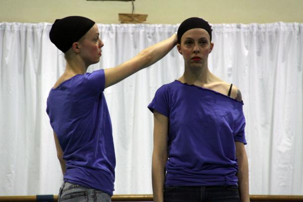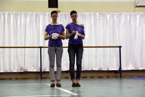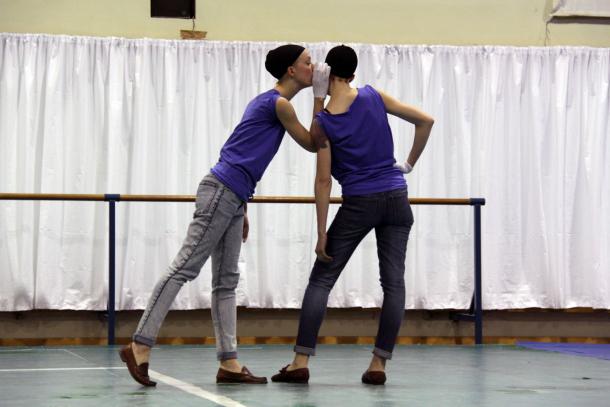 Dentro questa cornice, Monkey see, Monkey do dà spazioad accadimenti semplici, che trattengono una tensione al costante, senza scosse, fino al rischio della noia. Le due figure sono una di fianco all’altra, quando una voce registrata elenca le parti del corpo. Vicendevolmente, l’una evidenzia una parte indicata nel corpo dell’altra (con una mano guantata). L’atto “dimostrativo” di questo corp morcélé è tenuto compatto dalla nominalistica identificazione delle parti come immagine di sé nel proprio simile (la gemella) e torna indietro allo spettatore come un invito a pensare al proprio corpo (per segmenti), alla “forma” della propria immagine che si rivela un’identità a sé, altra. Questo cortocircuito iniziale informa tutte le azioni successive soggette a una dinamica di reiterazione circolare.