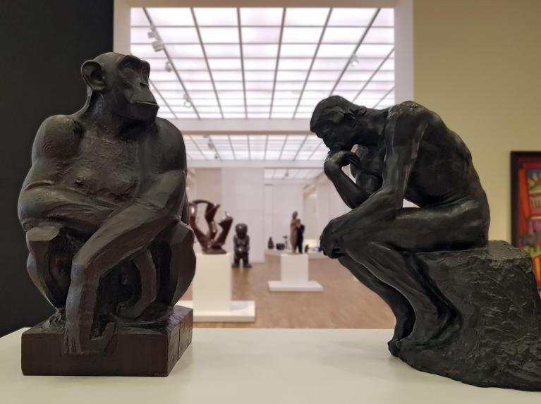 Diversi sono i punti in cui Hello World subisce le conseguenze impreviste di questa agenda. Ancor più della sezione Agora che accoglie i visitatori all’ingresso con una vacua, scontata retorica del dialogo e dell’accoglienza (e ciò nonostante la presenza di lavori interessanti come Pavilion for International Institute of Intellectual Co-operation, 2016, di Goshka Macuga), è nelle sale in cui è riunita una notevole selezione di sculture del XX secolo che si possono misurare i limiti della pedagogia espositiva adottata dai curatori. L’essenziale e intricata relazione tra ricerche moderne e arti “primitive”, l’arcaico, l’inc0nscio (la sezione è convenientemente intitolata Woher kommen wir?, “da dove veniamo?”), viene qui ricondotta a un semplicistico ridimensionamento del valore antiautoritario delle esperienze d’avanguardia, epitomizzato, con involontaria comicità, nell’accostamento tra Le Penseur (1880) di Auguste Rodin e il Ritratto dello scimpanzé “Missie” (1916-17) di Anton Puchegger. Molto più interessante osservare da vicino i lavori, tra cui spiccano ad esempio, accanto a nomi celebri (Brâncuși, Giacometti, Ersnt, ecc.), figure meno note come Hans Josephsohn, sua una impressionante “massa” vagamente antropomorfa (Senza titolo, 2002), o i molli volumi neri di Thomas Schütte (Senza titolo, nn. 4 e 10, 2001).