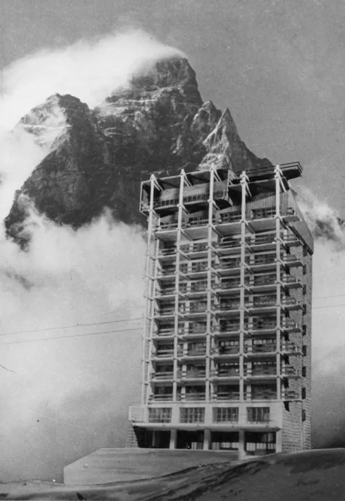 Una declinazione affascinante di questo tema sono le fotografie a tema sciistico. Vennero usate per un manuale: Mollino era anche maestro di sci. L’aspetto pratico, lo scopo didattico sono fondamentali, in questi scatti. D’altra parte, un architetto non può preoccuparsi solo della bellezza dell’edificio che costruisce, deve essere sicuro che stia in piedi. Eppure c’è qualcosa di più astratto o estetizzante di questi sciatori in pose iperdinamiche che stanno come sospesi nel nulla? O dei solchi dei loro sci perduti in una distesa di bianco?