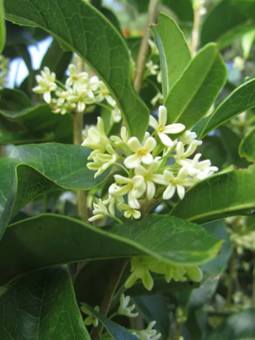 Sempreverde di lenta crescita, a ramificazione bassa, dalla forma tondeggiante e compatta, porta foglie lanceolate, opposte, coriacee, a margine liscio o, nell’Heterophyllus, dentato (perciò, da non confondere con l’agrifoglio). I fiori, seppur numerosi, sono miniaturizzati: stelline tubolari a quattro petali si aprono raggruppate sulle ascelle foliari o in coppa ai rami. Ricchi di oli essenziali, in Oriente – da dove è stato importato nella seconda metà del diciottesimo secolo – li usano in cosmesi e per aromatizzare il tè.