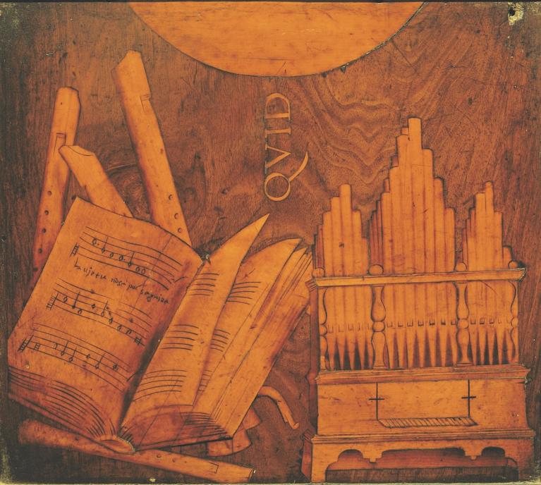 Lorenzo Lotto, Strumenti musicali e simboli, 1525, Bergamo, Basilica di Santa Maria Maggiore.