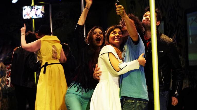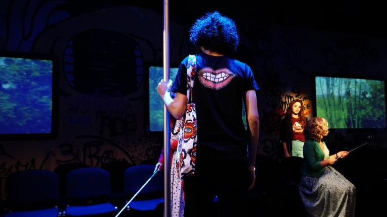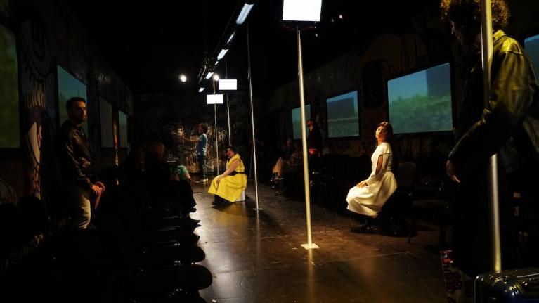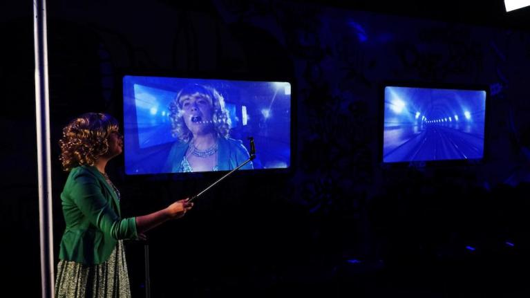 Col vuoto Orfeo ci sa fare: lo spettacolo, in quel tempo di passaggio che è un viaggio in metrò o in treno, riempie spazi e immaginazioni con una schiera di venditori ambulanti, che spacciano intrattenimento, arte, sentimenti. Una variopinta compagnia, guidata da una signora in giallo che dall’alto di una valigia di cartone si dichiara essere la Musica “ch'a i dolci accenti” sa “far tranquillo ogni turbato core”, e dà il via ai pastori un po’ fricchettoni che rivivono la storia di Orfeo ed Euridice, l’amore prima rifiutato da lei, poi condiviso, la felicità di lui che aveva incantato monti e selve con il suo canto sconsolato e ora può volgerlo in inni di gioia. I cantanti, giovani si diceva, bravi, interpretano i loro personaggi in quel budello rettangolare a stretto contatto con il pubblico ravvicinato: proiettano e ingrandiscono i visi, le loro reazioni, con selfie e dirette simil-facebook che dai telefonini scorrono su televisori installati nei “vagoni”. Mentre su alcuni schermi in posizione di finestrini scorrono immagini della città e poi la piatta verde campagna padana di queste parti.
