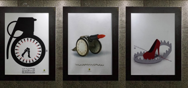 [Traduzioni dal farsi: i primi due da sinistra in alto: "Ogni secondo sono venduti nel mondo 22 rossetti!"; a seguire: "Non diventiamo l'esca con la quale satana intrappola gli uomini!"; "Hijab: una porta verso il paradiso".]