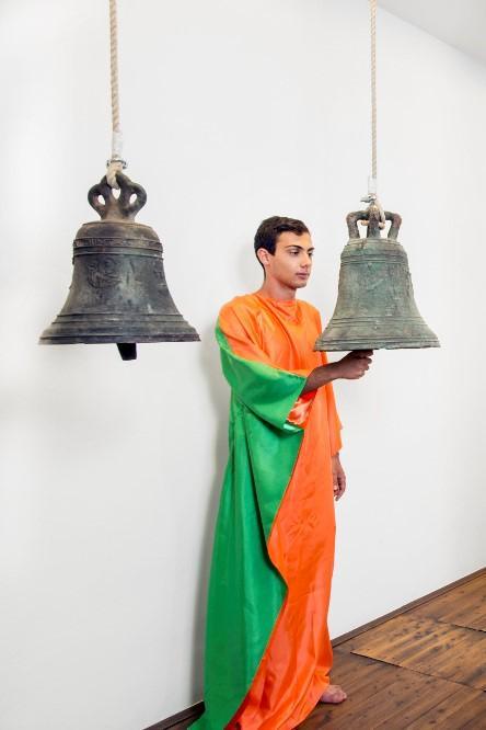 Altro elemento nuovo della mostra è costituito da due campane, una più grande per le ore e una più piccola per i minuti, suonate da un campanaro vestito davanti di arancione e dietro di verde. Anche le campane, naturalmente, riprendono la forma del vaso, capovolgendola, e introducono il tempo e il suono. Patella procede in questo modo, aggiungendo ad ogni passo un elemento che completa la costellazione – una delle opere è in effetti un dittico che riporta le costellazioni australe e boreale con al centro il profilo di Luca l’uno e di Rosa, la donna-moglie-musa, l’altro –, completa, dicevamo, la costellazione degli elementi moltiplicando e intrecciando i rimandi. È così che è costruita anche la sua opera nel suo complesso ed è questa “complessità” che Patella vuole tenere sempre viva nel suo modo di fare arte. Dentro di essa l’opera singola non è riducibile al suo “significato”, né può essere liquidata come simbolica o illustrativa di un’idea, benché questi aspetti la caratterizzino diversamente da altri artisti. Patella non ama i paragoni, per cui non indugeremo in confronti e differenze, ma davvero non c’è altro artista che faccia altrettanto. Tutto però non si riduce qui: le opere “lavorano” anche per conto loro e a ben vedere ogni singola opera, come è giusto che sia, in realtà contiene e condensa – è il caso di dirlo – l’intera logica dell’opus.