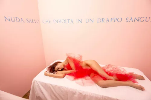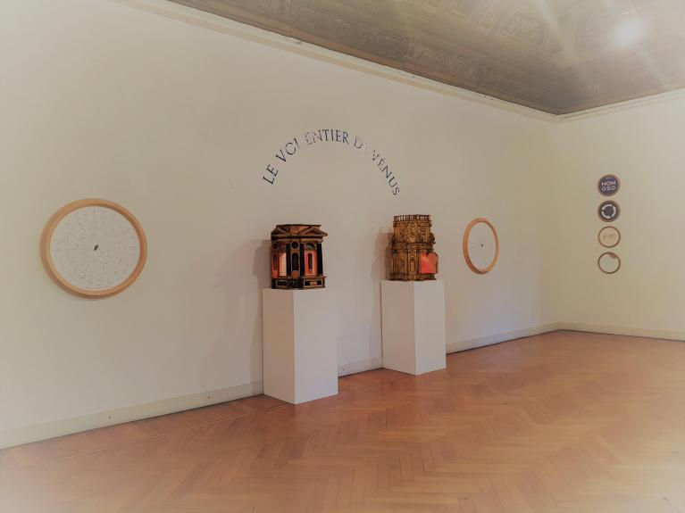Così, mentre con opera nuova Patella introduce il rebus del “non osare / osare non” in quattro tondi – è necessario che lo siano, perché in tal modo la negazione ruota, anzi è rotazione –, la mostra riprende la via della figura femminile con due tempietti che riportano ognuno una metà di Venere e sono uniti dalla frase scritta ad arco sulla parete “Le vol entier de Vénus” (dove “vol” sta per “volo” ma anche per “furto”, e unito a “entier” dà “volentieri”) e si chiude con una giovane Beatrice/Rosa distesa nuda alla fine del percorso, in una cameretta tutta rosa (aurorale), appena coperta da un tulle rossastro (la rubedo alchemica) e a sua volta sormontata da una scritta sulla parete che dice, citando dalla Vita Nova di Dante: “Nuda, salvo che involta in un drappo sanguigno leggeramente”. Ha gli occhi chiusi: dorme o è morta? Probabilmente dorme, dico io, e forse la mostra può essere riletta all’indietro come un suo sogno. Patella infatti da qualche tempo riproduce nei suoi cataloghi-libri d’artista dei disegni e racconti di suoi sogni, come anche in questo caso. Sembra così che le mostre stesse, le opere o i temi nascano prendendo spunto da sogni – “in parallelo”, dice Patella. Certo è per rielaborare e integrare quanto l’inconscio detta, ma diventa anche un riverbero che si stende sulla mostra e sulle opere, che assumono allora un aspetto onirico che, a me pare, aggiunge loro un carattere lirico che si tende altrimenti a non considerare. Sarà l’effetto della quantità di testi poetici che Patella negli ultimi anni ha pubblicato, sarà che lui stesso vuole legare anche questo al resto dei suoi interessi e ambiti di intervento: “tout se tient”, è questo il suo motto, la sua ambizione, la sua poetica, ed è pur vero.