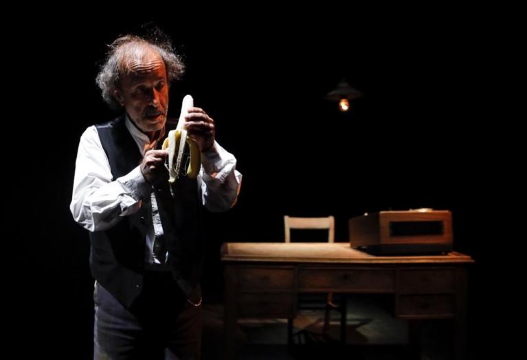 La sala è avvolta nel buio. Sotto un drappo nero che fa da sipario si trova Taiuti, seduto a una scrivania, immobilizzato in una posa plastica, lo sguardo fisso, le mani poggiate davanti a sé; solo una lampadina lo illumina dall’alto, il resto della scena resta nella penombra, l’impressione è quella di trovarsi di fronte a un tableau vivant di Caravaggio, un San Girolamo in meditazione. Il Krapp di Taiuti appare in linea con la descrizione del personaggio fornita dalle note di regia beckettiane – i capelli grigi arruffati, i vestiti consunti, il panciotto sgualcito, l’orologio da taschino, il mazzo di chiavi, il volto segnato – ma non dipinto di bianco, come in molte altre interpretazioni che hanno seguito in maniera più letterale l’indicazione della “white face” data da Beckett, prima su tutte quella indimenticabile di Bob Wilson.