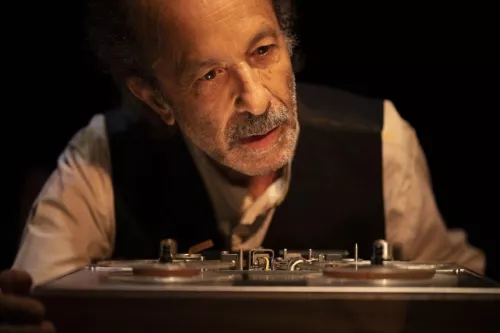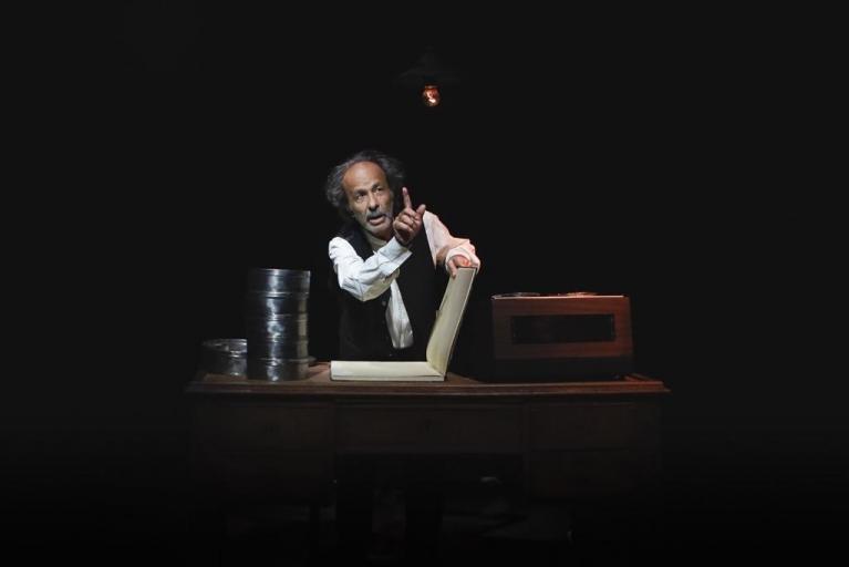 Fin dai primissimi minuti dello spettacolo, è chiara un’attenzione artigiana alla dimensione corporea e gestuale: una serie ripetitiva di micromovimenti del volto inquadrano subito il personaggio come un vecchio miope, stanco, schiacciato dal passare del tempo. Anche se calato in una dimensione umana più vicina a noi, l’aspetto grottesco e clownesco sottinteso da Beckett non va perso, anzi si esplica con forza nella corporeità viscerale dell’attore napoletano: il passo esageratamente claudicante con cui va su e giù per le scalette per trasportare le bobine da una seconda stanza alla scrivania (un’aggiunta drammaturgica di Taiuti), la schiena inverosimilmente curva sotto il peso di un piccolo dizionario, il respiro affannoso, il sorriso infantile che accompagna la parola “bobiiiiiina” ripetuta più volte; la dimensione del gioco e dell’incantamento appartiene alla storia teatrale di Taiuti, che ha esordito con la maschera di Pulcinella e ha più volte attraversato il teatro comico in coppia con Silvio Orlando.